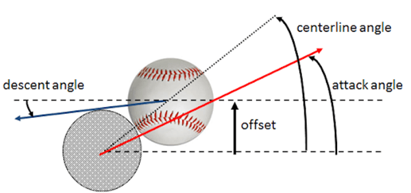 Momentum is transferred in a linear plane. As backspin rpms increase, optimum launch angle decreases. (Sawicki, Hubbard, & Stronge, 2003) Ball spin has been shown to increase the lift on the baseball. However, the type of collision needed to impart high amounts of backspin to the baseball significantly decreases the linear momentum transferred to the baseball. (Kensrud & Smith 2013) Baseballs hit with less spin have higher exit velocities and baseballs hit with higher spin rates carry further. There is a tradeoff between exit velocity and backspin, you sacrifice one for the other. A balance of both is the desired outcome. (Sawicki, Hubbard, & Stronge, 2003, Cross 2009, & Kensrud & Smith 2013) The “offset” (Figure 2-1) or the vertical distance between the center of mass of the baseball and the center of mass of the bat directly influences the tradeoff between exit velocity and batted ball spin rates. (Nathan, 2015) The offset in regards to this study will be launch angle subtracted from attack angle (launch angle – attack angle =offset). The centerline angle is the angle the “normal force” of batted ball collision follows in relation to the horizontal plane.