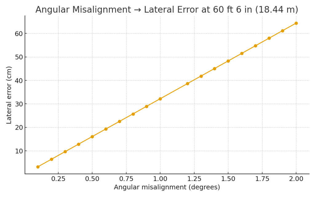It appears that yes, the distance of the task does matter. Eye dominance shifts or strengthens depending on task & viewing distance. The further the distance, the more the eye dominance bias increases. When your viewing target gets past 10 meters (32.8ft) ocular dominace peaks & starts determining line of sight. (Mapp, Ono & Barbeito, 2003) At 60ft 6in any binocular cues the brain might perceive from the different angles of the two eyes becomes impercebtible. Meaning the brain can’t gain any additional information from using the information available from both eyes. So it has to pick the information from the one deemed to have the best line of sight. Posture, movement, & task demand are all going to factor into which eye the brain decides to use. The line of sight matters, so lets try some math. An angular misalignment of the dominant eye as small as 1 degree can result in a 31.5cm (12.4in) miss of the attended target at 60ft 6in.
